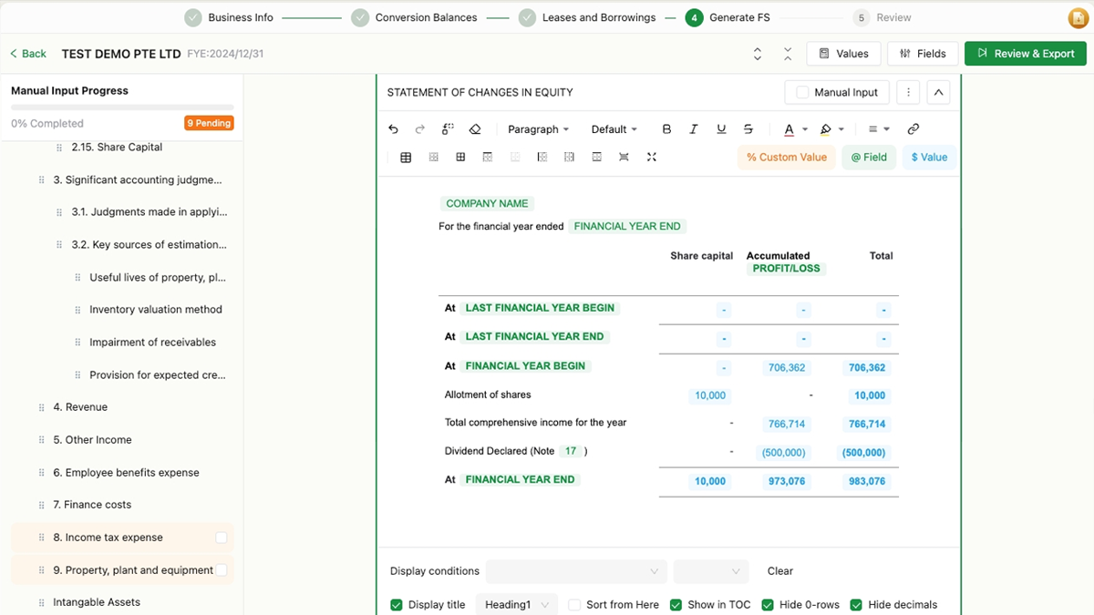 Instant, perfectly formatted Financial Statements—automatically aligned with the latest FRS standards.